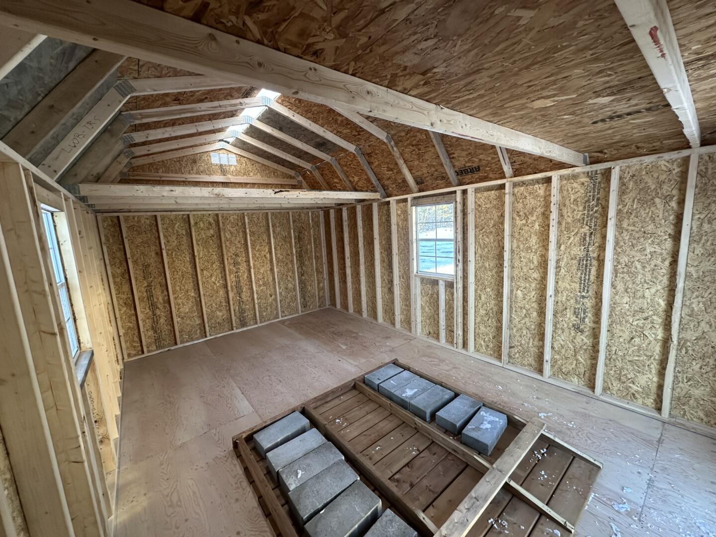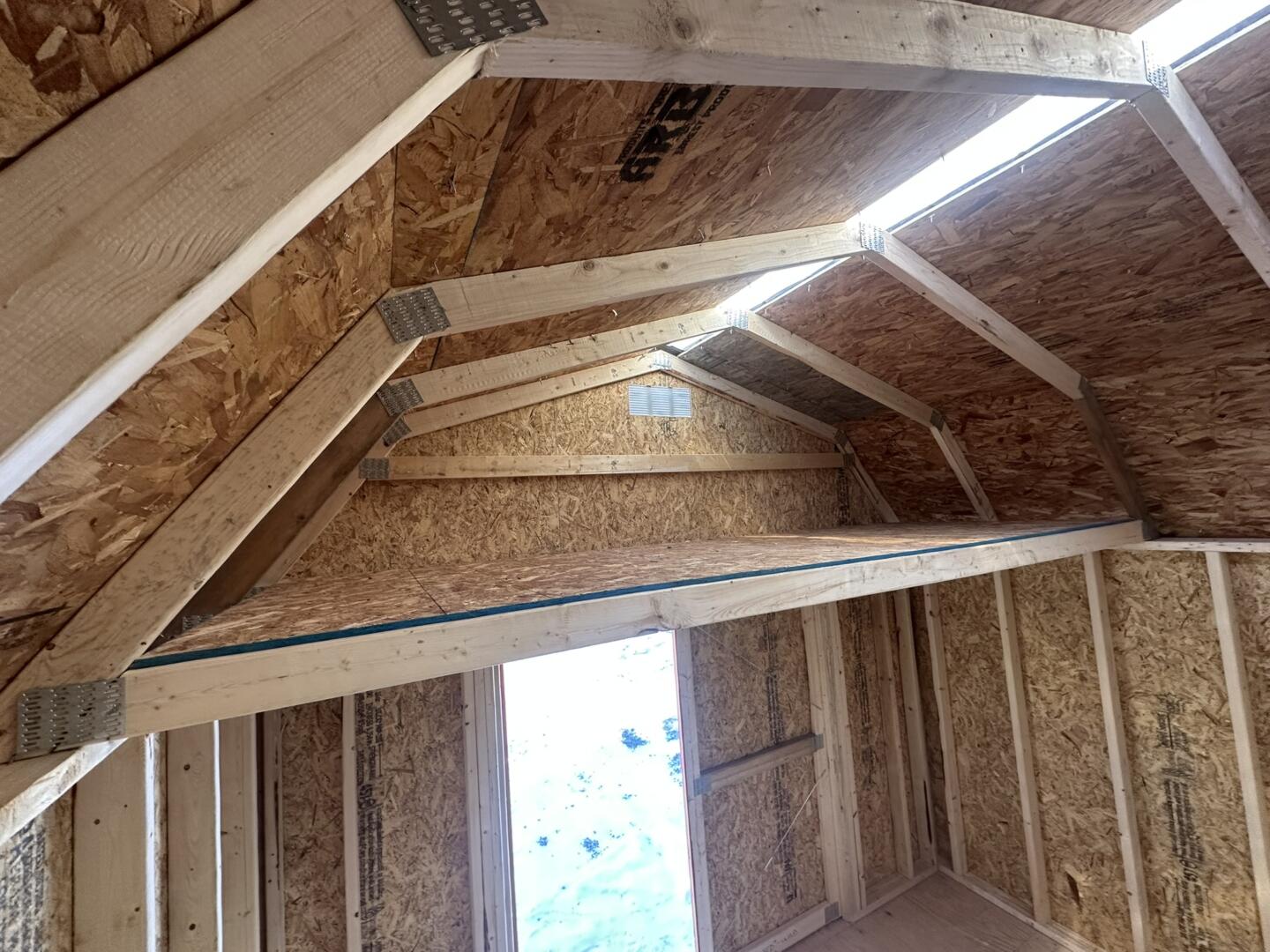 Points forts : lumière naturelle grâce à deux fenêtres guillotine 24″ x 36″ et un faîtage transparent, double porte 6′ facilitant l’entrée de VTT et tondeuse, et deux mezzanines pour maximiser le rangement vertical sans empiéter sur l’espace au sol.